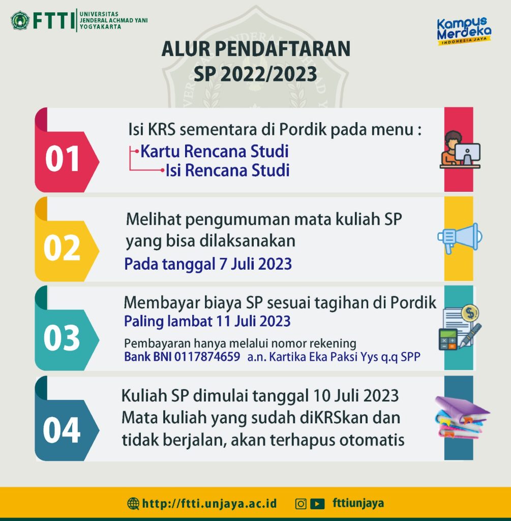 Hallo, selamat siang semuanya. Hari ini hari ke-2 pendaftaran SP. Bagi yang berminat mengikuti SP yuk segera daftar, pendaftaran ditutup tanggal 6 Juli 2023. Biaya SP Rp.110.000,/SKS (Rp.110.000 x SKS mata kuliah). Untuk mempermudah mendapatkan informasi SP yuk gabung di grup WA berikut :