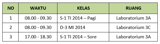 Daftar peserta dan pembagian kelas dapat dilihat pada tautan berikut ini. Didalam daftar tersebut, terdapat juga User ID yang akan digunakan oleh masing-masing mahasiswa saat mengikuti ujian. Silakan catat baik-baik.
