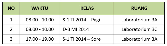 Peserta pelatihan yang terdaftar untuk periode ini terdiri atas mahasiswa S1 Informatika angkatan 2014 (77 orang) dan D-3 Manajemen Informatika angkatan 2014 (19 orang), dan terbagi menjadi 3 kelas, yakni S-1 Pagi (1 kelas), S-1 sore (1 kelas) dan D-3 (1 kelas). Pembagian kelas peserta sesuai dengan data akademik terakhir tentang status keaktifan mahasiswa. Setiap mahasiswa WAJIB mengikuti rangkaian kegiatan sesuai kelas masing-masing. Apabila terdapat kekeliruan, Anda dapat menghubungi pengelola untuk memastikan penempatan kelas. Kelas ini berlaku hingga proses sertifikasi selesai. Mahasiswa yang sudah LULUS KULIAH namun masih terdaftar sebagai peserta, tetap BERHAK namun TIDAK WAJIB mengikuti sertifikasi sesuai jadwal yang telah ditentukan.