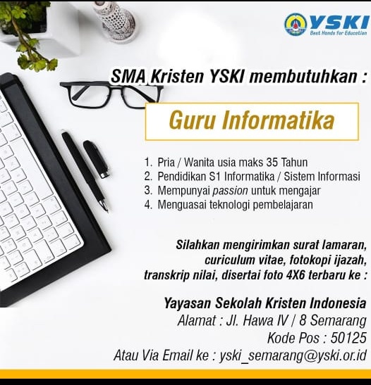 Berikut kami sampaikan informasi lowongan kerja Guru Informatika pada SMA Kristen YSKI Semarang, dan untuk informasi lebih lengkap silahkan dilihat pada Web resmi sekolah.