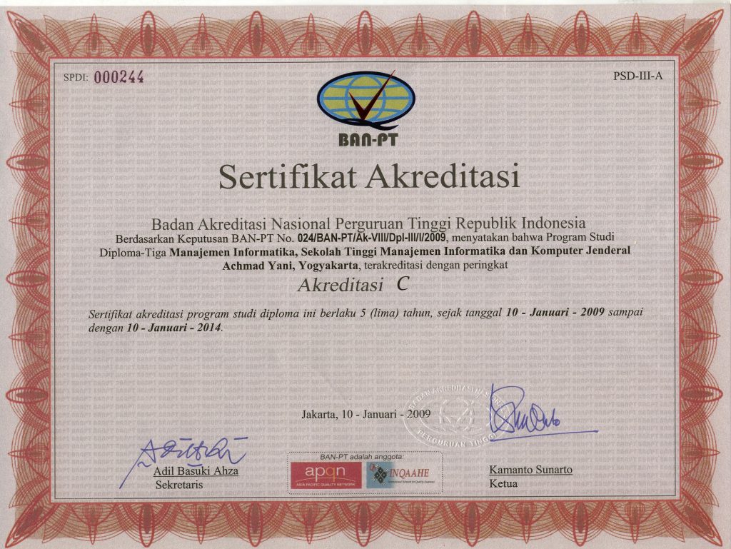 - Sertifikat Akreditasi Institusi,