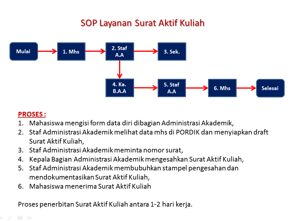 Berikut kami sampaikan prosedur pengurusan Surat Keterangan Aktif Kuliah mahasiswa. Prosedur ini digunakan untuk memberikan panduan pada mahasiswa dalam proses pengurusan Surat Keterangan Aktif Kuliah mahasiswa. Surat Keterangan Aktif Kuliah hanya dieberikan/bisa diurus oleh mahasiswa yang tercatat aktif di PORDIK (Pangakalan Data Pendidikan Tinggi).